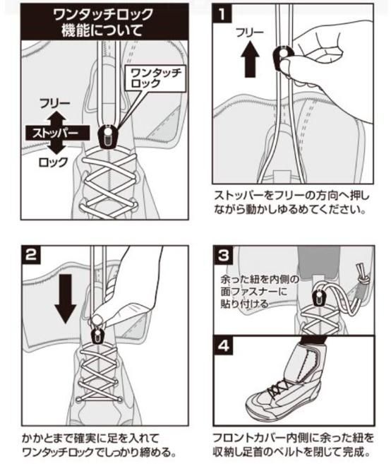 ダイワスピードフィット・システムを採用し、ワンタッチロックを移動させるだけで靴ヒモ結び不要な仕様(※ヒモとワンタッチロックのパーツがプラスで付属されています。)