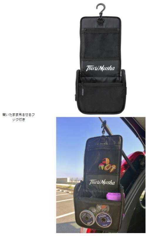 【収納・持ち運び・使い易さ】にこだわったパタパタオープンバッグ。リールや小物、遠征時の日用品などの収納に最適。 背面のベルクロは、ベルトや釣り公園の手すりに固定できます。タックルバッグからの面倒な出し入れ作業時に、地面に置きっぱなしなどを解消出来ます。 フックを使えば開いたまま吊るすことが でき、両手を塞ぐことなく釣りの準備が スムーズに行えます。