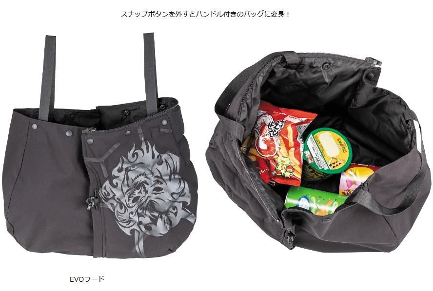 ファスナーの脱着でフード部分が分離し、スナップボタンを外すとハンドル付きのバッグに変身!