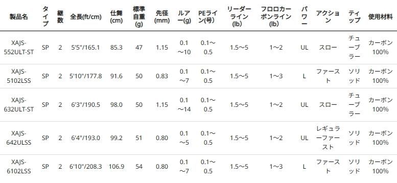 今までアジング専用ではなかった、スローテーパーのウルトラライトアクションのアジング専用の異端児モデル。上位機種リアルフィネスのTAFブランクスを継承。スローテーパーにありがちな重くてダルく、感度が悪いといった短所をTAF製法で全て解決。スローテーパーでありながら、ジグヘッドのリフト&フォールの掛けのスタイルに使用出来る軽さと感度を実現。スローテーパーの特筆すべき点は、日本海など潮が緩いシチュエーションで軽量ジグヘッドを操作しやすく、魚のアタリはもちろん、水圧や水流変化、地形変化を感じやすく、さらにはブランクス全体の反発力を活かせるので、1g以下のジグヘッドの飛距離がさらにUP。スローテーパー特有の粘りで魚の口切れを防ぎ、ショートバイトさえフッキングしなくともアタリを乗せてしまう実力はマジックとしか言いようがないほど。魚を掛けてからフルベンドで一匹ずつ楽しめる要素も魅力。アジやメバルといったメインターゲットから、メッキやショゴ、カマスといった小型回遊魚をまで様々な魚種を狙うことができる。ただし強風下、激流、ディープエリアを苦手とするが、それを十分に補えるほどの魅力が詰まっている。次世代スタンダードなNEWアジングロッドと言っても過言ではない。