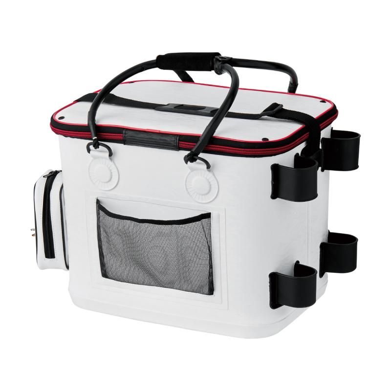 ●手にやさしいチューブハンドルを採用。●バッカンを内部に収納しても、上部にスペースが出来るように設定しているため水汲みバケツなどの道具類や予備の集魚剤の収納が可能。●上蓋にはスナップボタンを配置し、全開と半開の2段階の開閉が可能。●内蓋を採用することで魚の飛び出しを防止。移動時の水のこぼれを抑制。●斜めのファスナーからスムーズな魚の投入が可能。水切り穴を採用し、魚を活かしたまま水換えをする際に便利。●タモの柄や竿を仮置きできるロッドスタンドを配置。●ポンプポケットはファスナー仕様でポンプをしっかりホールド可能。●ポケット下部にはハトメを設けることで、水が溜まるのを防ぎます。●ポンプホースは専用口を通して内部へ入れることが可能。●特殊エンボスシートを採用。