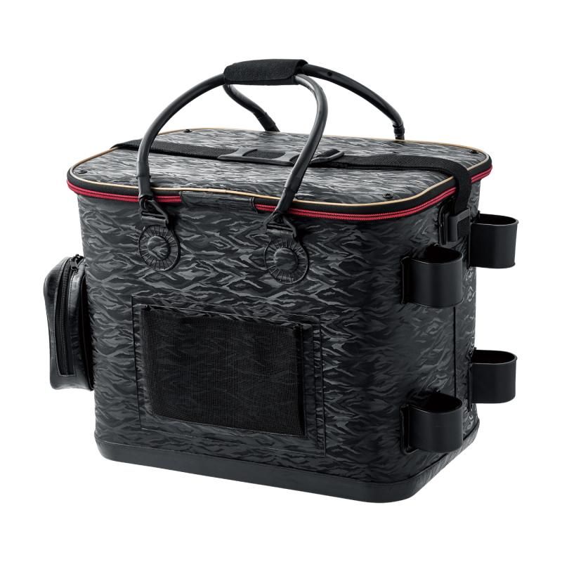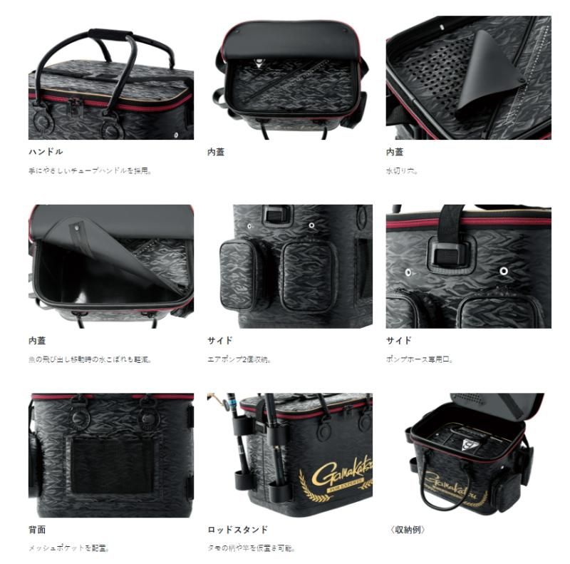 ●手にやさしいチューブハンドルを採用。●バッカンを内部に収納しても、上部にスペースが出来るように設定しているため水汲みバケツなどの道具類や予備の集魚剤の収納が可能。●上蓋にはスナップボタンを配置し、全開と半開の2段階の開閉が可能。●内蓋を採用することで魚の飛び出しを防止。移動時の水のこぼれを抑制。●斜めのファスナーからスムーズな魚の投入が可能。水切り穴を採用し、魚を活かしたまま水換えをする際に便利。●タモの柄や竿を仮置きできるロッドスタンドを配置。●ポンプポケットはファスナー仕様でポンプをしっかりホールド可能。●ポケット下部にはハトメを設けることで、水が溜まるのを防ぎます。●ポンプホースは専用口を通して内部へ入れることが可能。●特殊エンボスシートを採用。