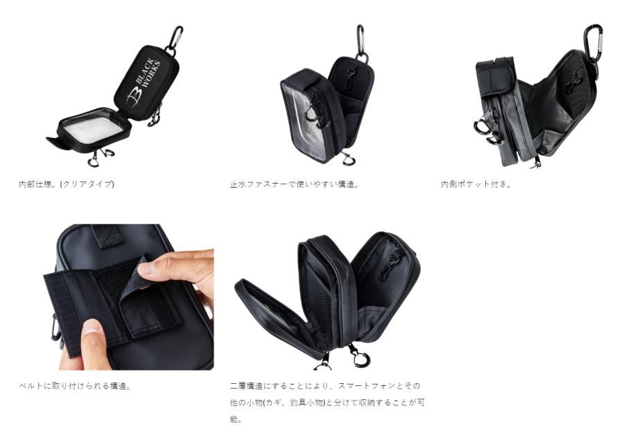 ●本体を二層構造にすることにより、スマートフォンとその他の小物(カギ、釣具小物)と分けて収納することが可能。
