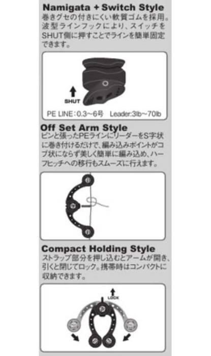 NEWカラー「ミリタリーカラーズ」新登場!カラーは「フォリッジグリーン」「ダークアース」の2カラー。誰でもカンタン!確実!スピーディ!に編み込みノットができるアシストツール。スイッチ式波型ラインフックとオフセットアームで、PEラインとリーダーをFGノットで簡単、確実、スピーディに結束できます。ボディには高強度、サビないGFRP(ガラス繊維強化プラスチック 含有率55%)を採用し、携帯時にはアームを閉じてコンパクトに収納できます。