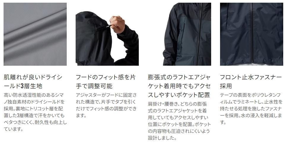 釣り場での使用を考慮し、シマノ独自の防水透湿基準をクリアしたドライシールド3層生地を採用しています。