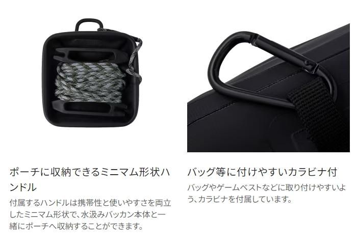 防水生地のポーチに収納できるコンパクトな水汲みバッカン。