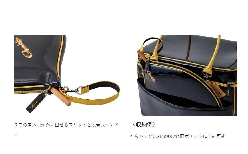 ●表地には、雨などの水汚れに強く、エサなどの汚れが付着しても拭き取りやすいP.V.C素材を採用。内側生地には、耐摩擦に優れたナイロン生地を使用しています。●持ち運び時に便利な脱着式ハンドルを採用し、持ち運び時や釣行中の風が強い日などにはバッグのハンドルやショルダーベルトに固定が可能。●へらバッグ5 GB390の背面ポケットに収納が可能。●脱着式ハンドルは物干しざおなどに干す際にも便利です。●タモの差込口が外に出せるスリットを配置しています。●36cmまでのタモ枠の収納が可能。●濡れた手でもつまみやすいラバー引き手を採用。※使用している素材の特性で本体にキズ、シワが発生する場合があります。
