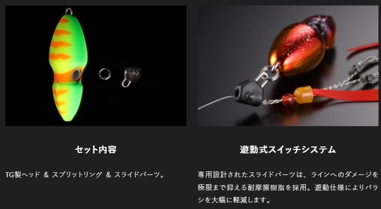 また、スイッチ特有の並列構造により、ネクタイ+フックをセットした状態でもボリューム感が抑えられ、ボディへのバイトもフッキングに持ち込みます。