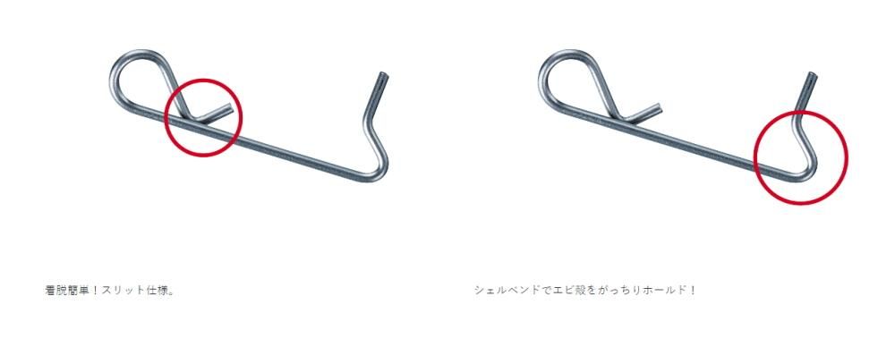 特徴は急角度で曲げた「シェルベンド」。エビのシェル(殻)をがっちりホールドし、エビをキープ。たとえ、頭を食いちぎられても胴体部分はしっかり残るので、セカンドバイトでのフッキングチャンスが増加。さらに遊動式鯛テンヤなどの小さなスイベルにも対応するようにワンタッチ部分の隙間をなくし、ホールド性アップ。