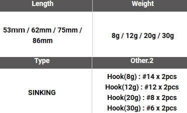 逃走する小魚のシルエットを忠実にイミテートした水平スイミング姿勢は、いかなる速度においても一定のロール軸を保持、生命感あふれるハイピッチバイブレーションを発生し、フィッシュイーターの捕食本能を猛烈に刺激。