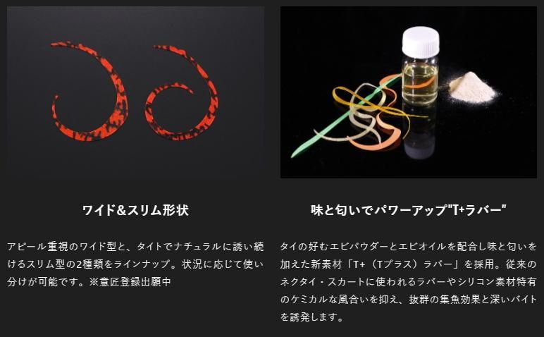 ネクタイの根本からキレのあるアクションを生む専用設計。しっかりとアピールできるワイド型と、喰い渋りや潮が早い状況下でもバランスを崩さず、艶めかしく誘い続けるスリム型の2種類をラインナップ。