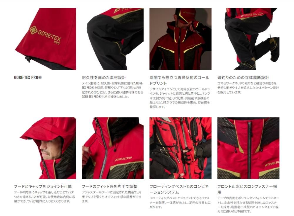 コンビネーションシステム、フードやジャケット裾口、パンツ裾口などのサイズ調整機能など、磯の基本性能とフラッグシップのクオリティを発揮するモデルです。