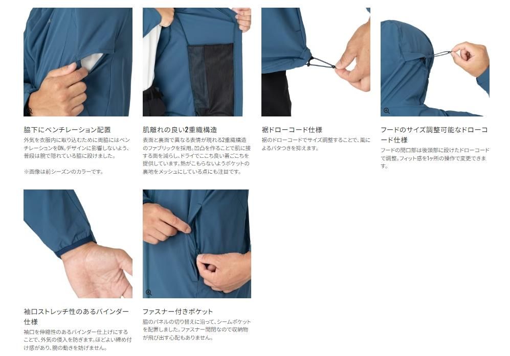 表面には撥水加工、肌面には凹凸のあるドライタッチ素材を使用した二重織構造。脇下にはベンチレーションを設け、左右ポケットはメッシュ素材がついた蒸れにくい仕様となっており着ごこちは快適。フードと裾のドローコードが、風でバタつかないよう調節可能に。朝晩の冷え込む時間帯にさっと羽織ることができ動きやすいので、キャスティングも問題なくできて幅広いシチュエーションで使える1枚です。