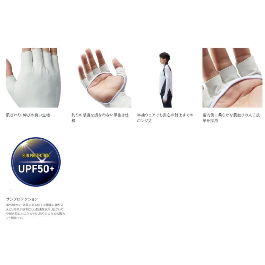 サンプロテクション生地を採用した日焼け対策グローブ。掌抜き、5本指抜き仕様のナチュラルな装着感で紫外線から肌を守ります。肘上まで保護するロング仕様で半袖ウェアとコーディネート。