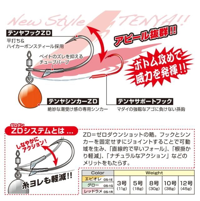 素早いフォールとスリ抜け性に長けるZDシステムをひとつテンヤへ反映。フォール時の姿勢を安定させ糸ヨレを防ぎ、底取りのしやすさと潮受けのよいシンカーフォルムでアングラーの意図を明確に伝え、マダイを誘います。特にボトム攻めでポテンシャルを発揮。