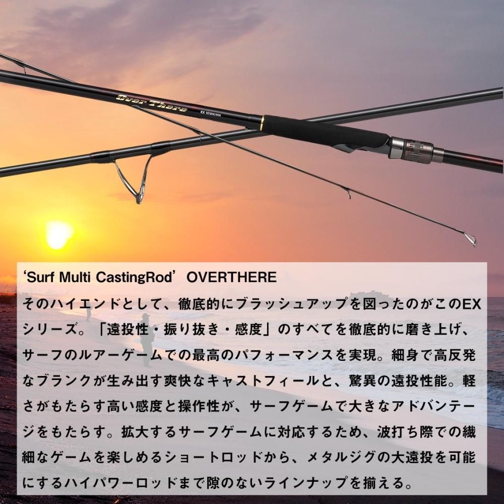 サーフから遠投を繰り返し、フラットフィッシュや青物を釣るサーフマルチキャスティングロッドのハイエンドとして、OVERTHEREが再始動。徹底的にブラッシュアップを図ったのがこのEXシリーズ。「遠投性・振り抜き・感度」のすべてを磨き上げ、サーフのルアーゲームでの最高のパフォーマンスを実現。細身で高反発なブランクが生み出す爽快なキャストフィールと、驚異の遠投性能。軽さがもたらす高い感度と操作性が、サーフゲームで大きなアドバンテージをもたらす。拡大するサーフゲームに対応するため、波打ち際での繊細なゲームを楽しめるショートロッドから、メタルジグの大遠投を可能にするハイパワーロッドまで隙のないラインナップを揃える。