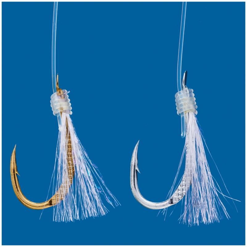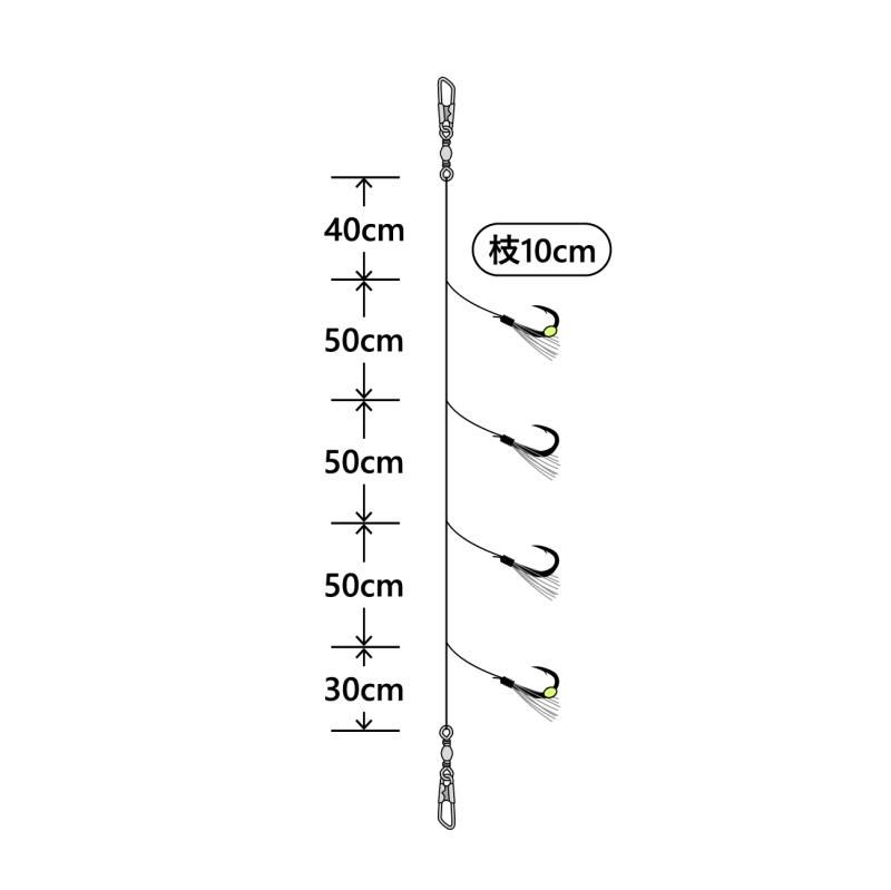 4本鈎仕様で危険な取り込み時のトラブルを軽減。下向きに出した枝が落し込む際に広がり、ベイトの乗りを誘発。またハリスが折れ曲がらずに結節強度の低下を押さえます。カラ鈎仕様とファイバー仕様を状況に応じて使い分けください。