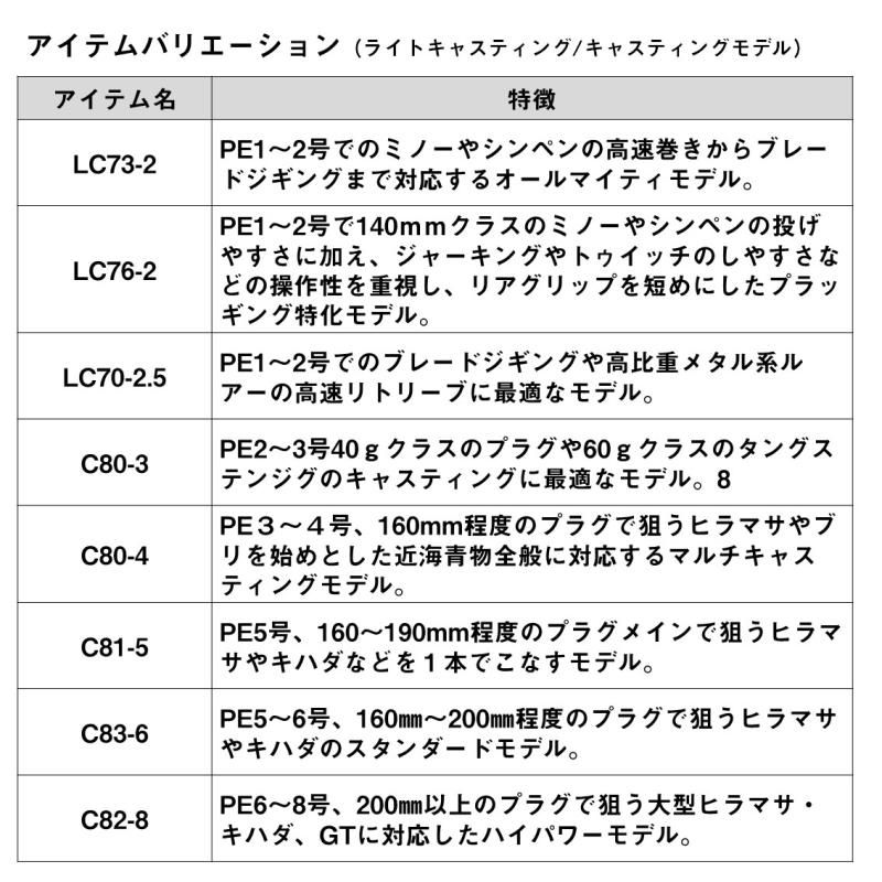 サワラや小〜中型青物などPE1〜2号程度で狙うターゲット向けに開発。港湾や湾口、近海で出番の多いミノーやシンペン、小型トップウォータプラグ、30〜50g程度のジグやブレードジグなどの遠投、早巻きに対応させており、ボートシーバスロッドでは弱いし、本気の青物キャスティングロッドならちょっと強い、という隙間を埋める軽快なキャスティングモデル。通常のキャスティングロッドとは異なり、エアセンサーリールシート採用により軽量化・操作性も追求している。