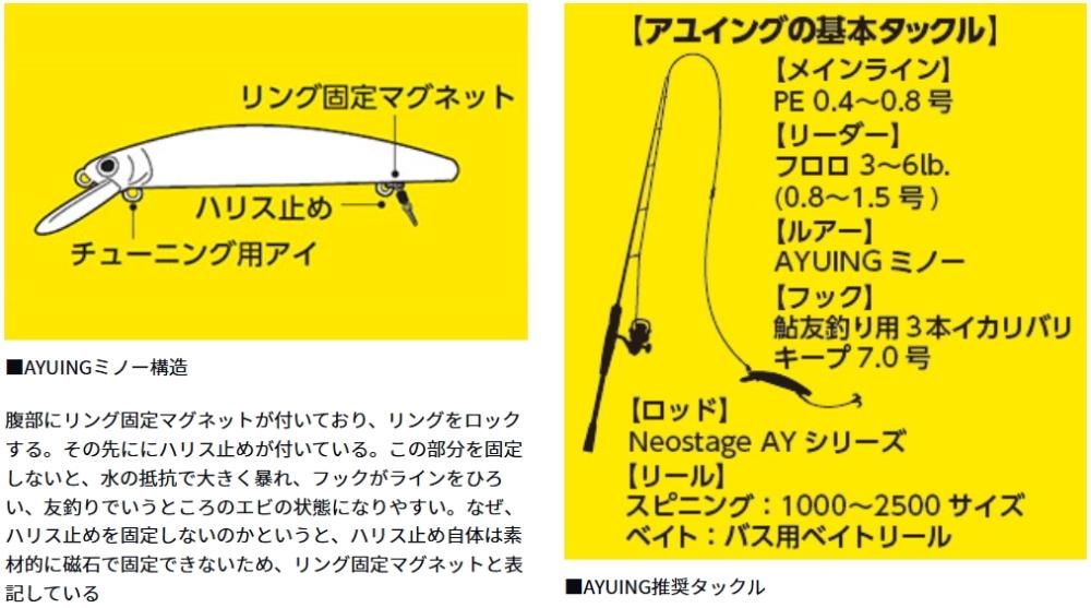AYUINGミノーが従来のミノーと大きく違う点は、後方アイが腹部についており、その先に自動ハリス止めを用いている点である。こちらのハリス止め部分に友釣り用イカリバリを付けて使用する。また、後方のアイの後ろにはマグネットが埋め込まれており、スプリットリングを固定し、イカリをまっすぐ後方へ垂らす働きをする。