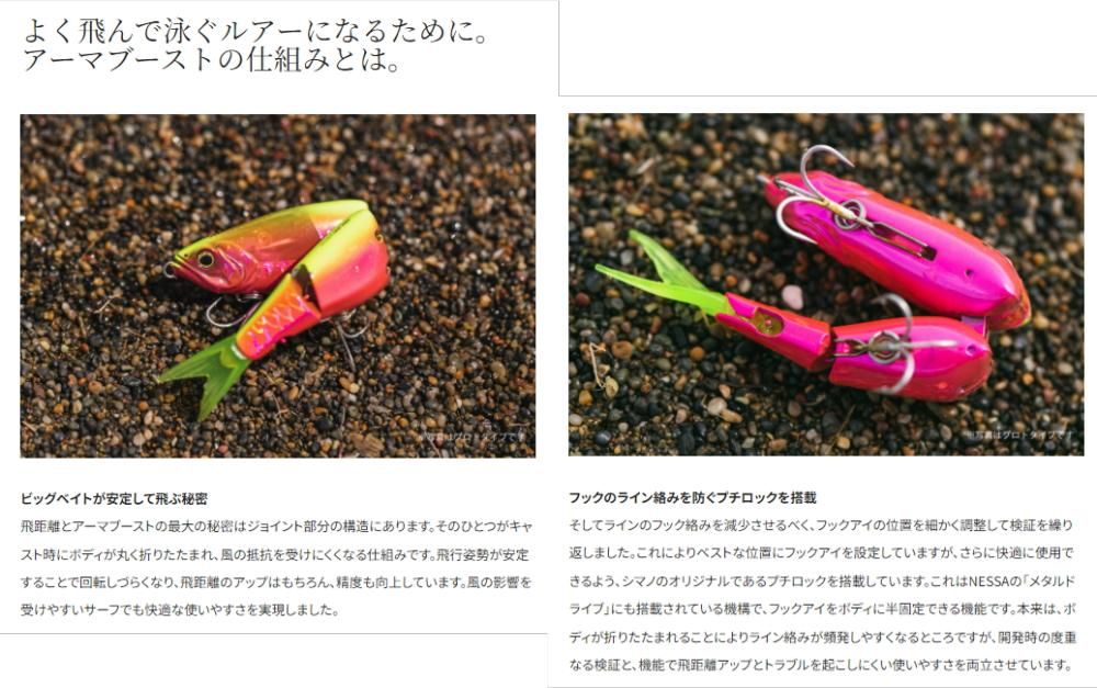キャスト時にボディが丸くなることで空気抵抗が減少して飛距離がアップ。いままで届かなかったポイントへのアプローチが可能となり、これまでの常識を打ち破る、サーフでビッグベイトを投げるという新しいスタイルの確立に成功しました。このジョイントボディを活かした艶めかしいアクションは、ランカーサイズへ強烈にアピールして捕食本能を刺激します。リアルなフラッシングを伴うスケールブーストと、止めても誘えるフラッシュブーストの効果を組み合わせることで、さまざまなテクニックを駆使することも可能です。