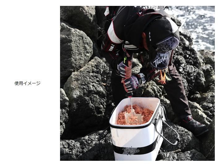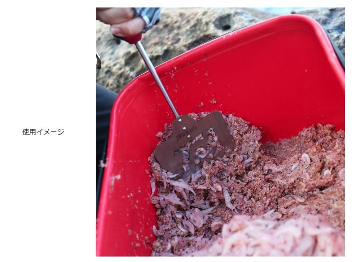 現場でのエサ作りは、早くかくはんができ、力を加えて混ぜる事で集魚材との粘りが保たれます。TMプッシュクローはグリップ部が250mmの長さで両手の力で混ぜ合わせシャフト部が7Φステンレス軸は強度に優れ効率の良いエサ混ぜができます。