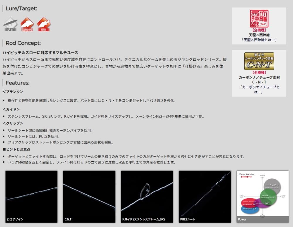 ハイピッチからスロー系まで幅広い速度域を自在にコントロールさせ、テクニカルなゲームを楽しめるジギングロッドシリーズ。緩急を付けたコンビジャークでの誘いを掛ける事を得意とし、青物から底物まで幅広いターゲットを相手に『仕掛ける』楽しみを体験出来ます。