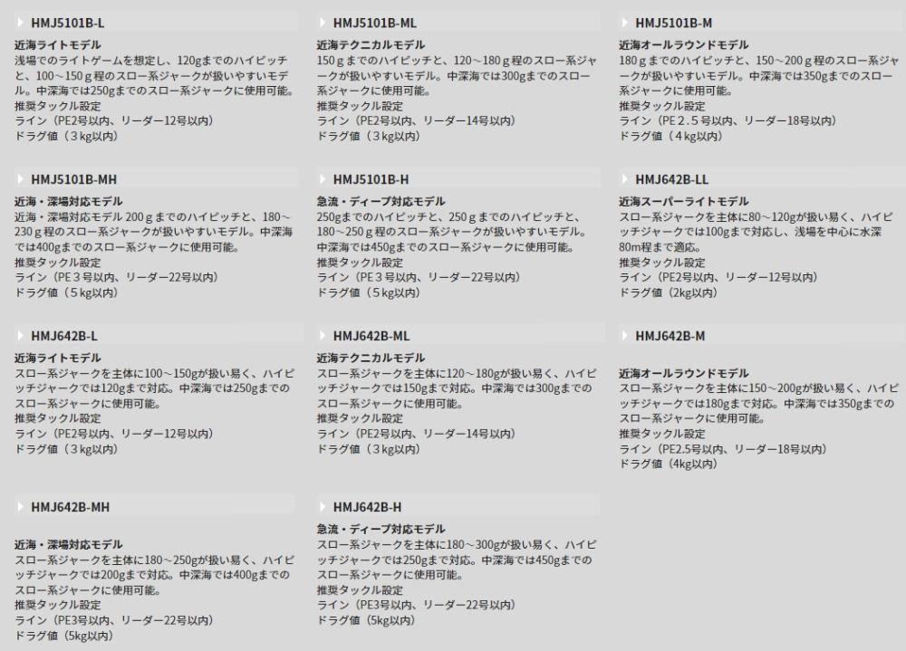 ハイピッチからスロー系まで幅広い速度域を自在にコントロールさせ、テクニカルなゲームを楽しめるジギングロッドシリーズ。緩急を付けたコンビジャークでの誘いを掛ける事を得意とし、青物から底物まで幅広いターゲットを相手に『仕掛ける』楽しみを体験出来ます。