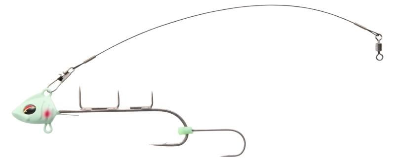 引き抵抗軽減!ダート形状ヘッド。貫通力抜群のサクサスフック親針。ショートバイト対応のアシストフック、タチウオの鋭い歯から守るステン線ショートリーダー、エサ巻きステン線、ケミホタルが装着できるケミホルダー付き。