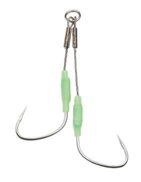 バーブレス並の貫通力と、ストッパーによるキープ力を両立するマジックバーブレス採用の「AS-07 サーベリクス」を使用。鋭い歯に切られる心配のないワイヤーを使用し、フックを段差にセッティングした太刀魚ジギング特化型アシストフックです。チモトに夜光チューブを配し、効果的に太刀魚のバイトを捕らえ、船上でのフックリリースも容易にすることで数釣り・大型狙いの両方が楽しめるサーベリング専用アシストフックです。