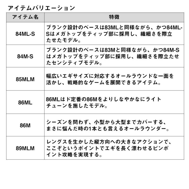 軽量AIRシリーズを更に軽量化し、86Mで驚愕のアンダー90gの「86g」を達成。岡隆之、木森直樹、福島芳宏が各フィールドテスターが監修したシグネイチャーモデル。ガイドには『AGS』搭載し、バット部はCリングにてチューンナップ。ブランクには軽さだけでなく、強度も向上したSVFナノプラスを採用また、ネジレ防止の最適構造X45により更に操作性向上。