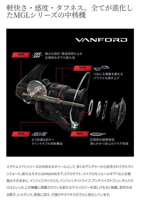 軽快さとリーリングのレスポンスを追求したマグナムライトシリーズの中核モデルとして、テクニカル系、フィネス系をはじめ幅広いゲームで活躍するヴァンフォード。NEWモデルは前作の軽快な操作性と感度、心地良い巻き感を受け継ぎつつも、インフィニティクロス、インフィニティドライブの搭載でパワフルな巻き上げとギアの耐久性がいっそう向上。耐摩耗性に優れたデュラクロスの採用により、ドラグの耐久性もシマノ基準で従来比約 10 倍と大きく向上しています。また、新搭載のアンチツイストフィンがライントラブルを抑制し、快適な使いごこちがさらに加速。新登場のC2500SXGを含む全 13アイテムはエリアトラウト、バスフィッシングからエギング、シーバス、ショアジギングまでをカバーし、新時代のルアーゲームにふさわしいラインナップとなっています。
