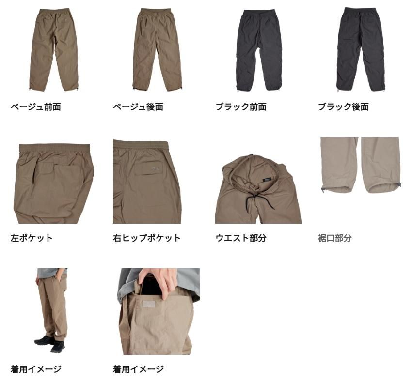 ナイロン素材を使用し、パターン設計でウエスト周りにゆとりを持たせ、裾に向けて細くしたワイドテーパードのシルエットにすることで、フィールドでも使える機能性と普段でも使用可能な見た目を両立したパンツになっています。