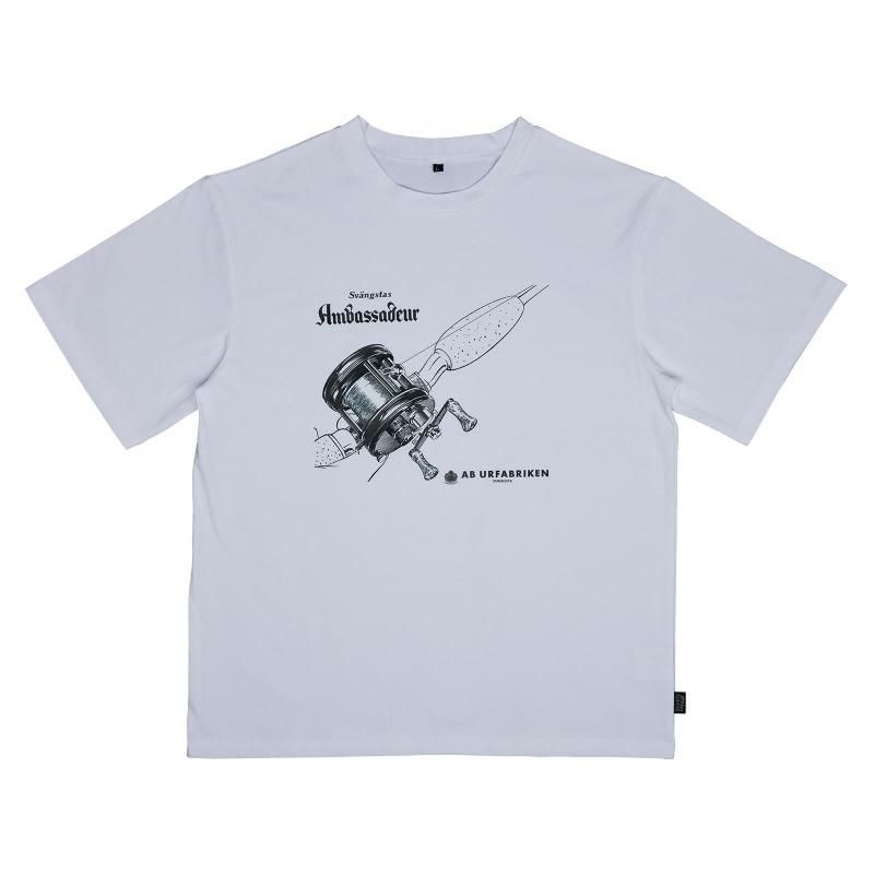 フロントに1954年のABUアンバサダーリールの広告グラフィックをプリントしたアンバサダーファンなら必須の一着