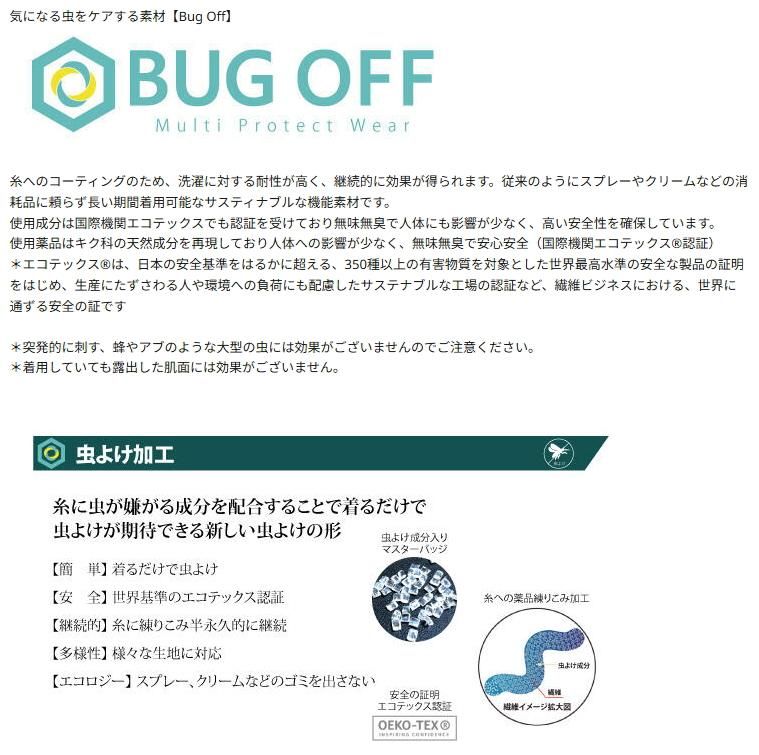 キク科の天然成分を再現した薬品を糸の段階で練り込むことで、虫が衣服に止まったとき近寄りにくくなります。