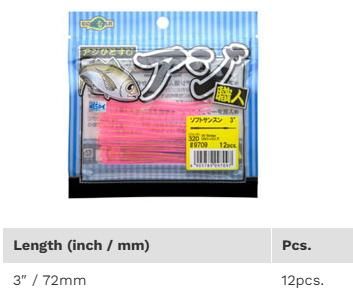 もともとコアなアジングアングラーのなかでシークレットベイトとして使われていた「サンスン」を、アジング専用仕様にリファインしたのが「アジ職人 ソフトサンスン」。アジの微弱な吸い込みバイトに対応するため、超ソフトマテリアルを採用。艶かしくしなやかに誘い、そしてバイト時には弾くことなく口の中へスムーズにおさまります。さらにノンソルト仕様にすることで、フォール時間を長く作ることができ、アピール力がアップ。カラーバリエーションもアジング専用ラインアップ。「アジ職人 アジマスト」とのローテーションで、死角の無いアジングゲームを可能にします。