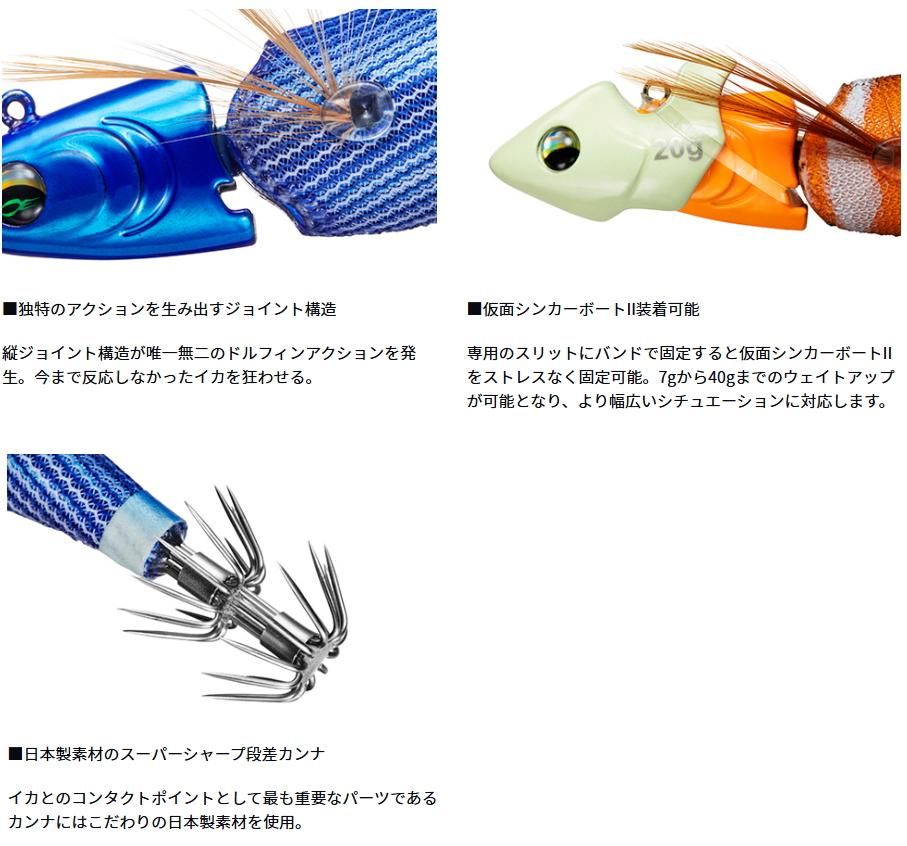 縦ジョイント構造によりアクション時に艶めかしく滑らかなドルフィンアクションを発生させる。また仮面シンカーボートIIを装着可能なため、様々なシチュエーションにも対応。ティップランを快適にする速いフォールスピードとヒット時にはジョイント部がイカの動きに追従することでバレも軽減。