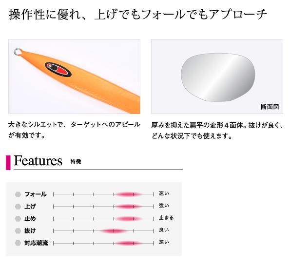 細長かつ幅広なシルエットがもたらす高い操作性は、深めの水深や二枚潮などの複雑な潮でも、ジャークでの上げのアクションとフォールアクションでターゲットにアピール出来ます。 またタックルバランスを合わせにくい状況でジグが上下運動しかしていない場合でも、左右非対称の回頭性設計によりジグ自身がキリモミ状の動きで変化を生み、バイトチャンスを増やしてくれます。 ショートタイプジグのオールマイティがクランキーならば、セミロングタイプジグのオールマイティはアークではないでしょうか。 パイロットジグとしてもおすすめのジグです。