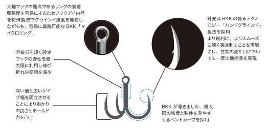 Raptor-Zは世界中のモンスターフィッシュを『確実に獲る』為に開発された世界基準のルアー用トレブルフックです。 不意な大物、怪魚、マグロやGTにまで対応できるスペックに仕上げています。 フックアップ率、貫通力、防錆力、全てを極限まで高めるBKKのテクノロジーを採用。最先端の熱処理を加え高次元の弾性・復元力を実現しました。 コーティング剤としてBKK独自開発の『Ultra-Antirust』を使用。高度の防錆性があり、最善状態を長時間保ちます。 全世界対応トレブルフック『Raptor-Z』究極の機能美を是非体験してください。