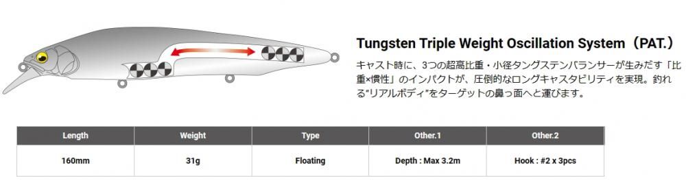 カナタ+1 SWは、カナタSWの潜行深度より1m深く、最大潜行深度を3.2mに設定したダイビングモデル。カナタSWと同様、160mmというビッグサイズにも関わらず引き抵抗は極めて軽く、テンポよくエリアをサーチするレスポンシビリティも兼備。更に磨きをかけたハイピッチ・ロールアクションにより、ビッグボディとは思えないナチュラルタイトな波動とリアルな明滅アピールを生み出します。防波堤や沖堤など足場の高い場所からのアプローチで、一段下のレンジを足元まできっちりと攻め抜くことが可能なカナタ+1 SWは、大型のベイトを追って日中にタナ落ちしたシーバスや青物の攻略に無類の強さを発揮します。圧倒的な存在感と、捕食中枢を刺激してやまないナチュラルな泳ぎを両立させた、ハイインパクトミノー「カナタ+1 SW」が、フィールドをより広く、より深く攻略します。