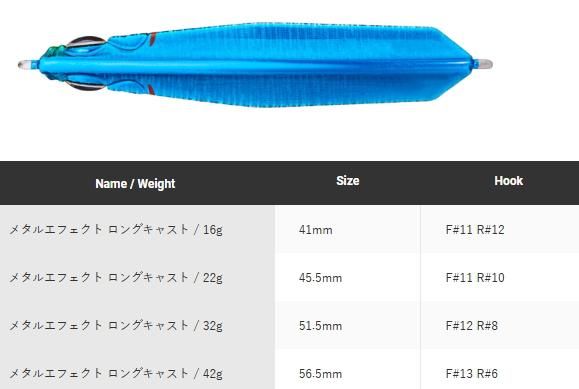 メタルエフェクトシリーズに待望のロングキャストモデルが登場。メタルエフェクトStay Fallは縦の釣り、メタルエフェクトBladeは横の釣りなのに対して、メタルエフェクトLong Castは飛距離を最大の武器とし、今まで届かなかったポイントを攻める為だけに焦点を合わせ開発を行った。ウェイトの配分はややリアバランスに設定し、安定的な飛距離を出す為に特徴的な断面を持つボディー形状としている。ベリーとバック部分には窪みを設け、飛行時に空気の流れる部分を作り、ブレを無くす事でより飛距離を確保。この窪みは水中においても水を掴むため、シャクッた時にもジグが不必要に水中で暴れる事を防ぎ、ライントラブルの減少にも貢献している。側面に関してはこのLong Castには窪みは設けず、平面を採用することで、あらゆる角度からの光の入射に対応し、水中でのフラッシング効果を最大限に引き出す事が可能になり、集魚効果を高めました。届かなかったその先を攻めるのに、必要な要素を全て詰め込んだルアーの完成です。