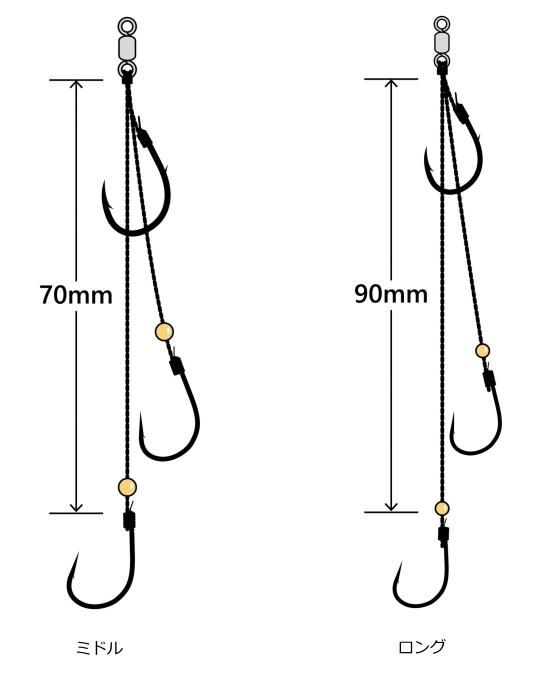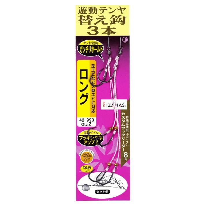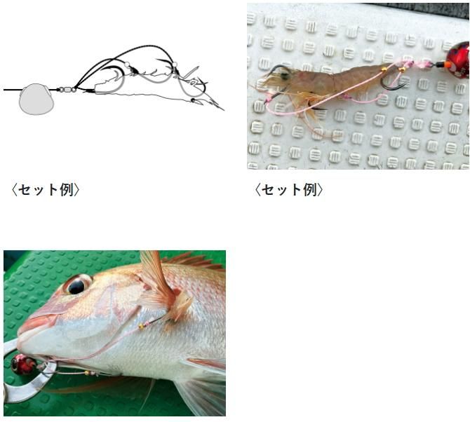 活きエビに負担の少ない小型親鈎はケン付きでエビをがっちりホールド孫鈎ダブルでフッキング率アップ!中〜大型のエビには尾、腹、頭部と3点のバイトポイントをカバー。小さなエビには3匹付けなど欲張り仕様にも対応。カスタムフックリーダーの強度としなやかさと適度な張りが活きエビの動きにも追従。しなやかさは冷凍エビでも頭部欠落を防ぎます。