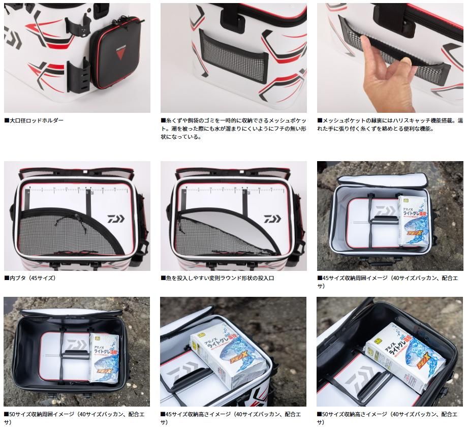 魚のサイズを確認できる簡易メジャー、フタの仮留めができるスナップ付き。