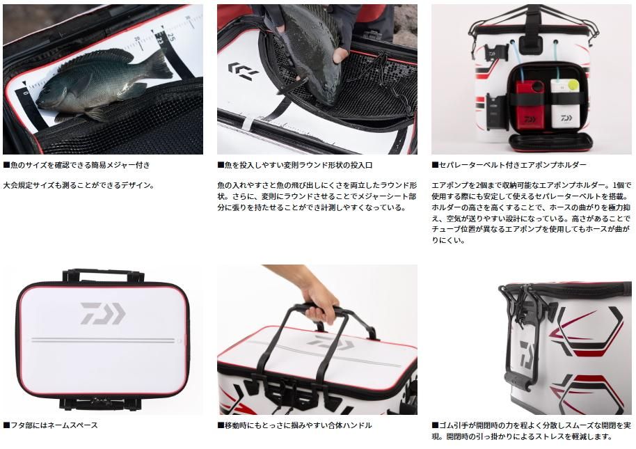 魚のサイズを確認できる簡易メジャー、フタの仮留めができるスナップ付き。
