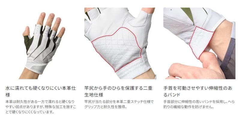 特殊加工を施した本革仕様でしなやかな着けごこち。水に濡れても硬くなりにくいへらぶな釣り用のグローブです。生地を二重に使った手のひら部分にはステッチを施しグリップ力をアップ。着脱がしやすいよう手首回りの構造を見直しました。アップグレードした縫製糸で耐久性も向上しています。シマノへらグローブの決定版です。(左右別売)