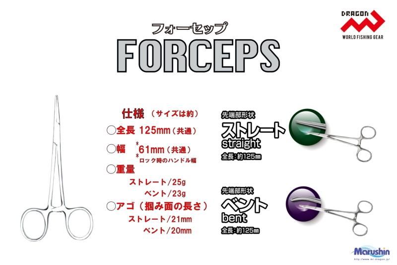 リニューアルされたNEWフォーセップは、ストレート・ベントの2形状で全長はともに約125mm、重量は約23g〜25gと軽量化!
