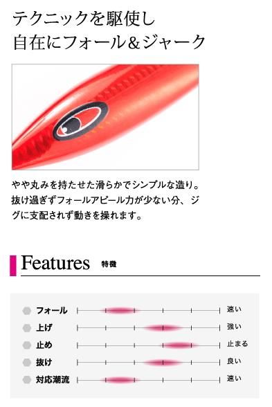 「意のままに扱う。テクニックのアビス」潮の流れやアイテムの動きに縛られず、テクニックを駆使してジギングを楽しみたい。そんなアングラーに向けて開発したジグです。使い手の思いのままフォールを操れるよう、凹凸のない流線型のシルエットに設計。一方ジャーク時にはジグの移動距離を容易に調整でき、ターゲットに合わせたアピールアクションが可能です。スローピッチジャークに慣れ親しんだ熟練者にこそ使っていただきたい、ジギングの奥深さを追求できる一本です。