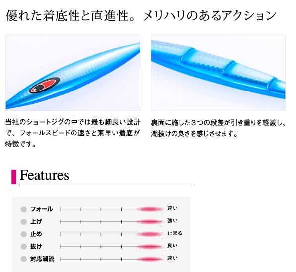 「上げ重視のショートジグ、スパンキー」スリムなシルエットのショートジグです。設計時にこだわったのは、引き抵抗の軽減。ボディ裏面に複数の段を設け、潮抜けの良さを実現しました。抜群のフォールスピードとポイントへの差し込みの良さを持ち合わせており、潮流が速い状況、あるいは二枚潮・三枚潮下で力を発揮。フォールでも上げでも青物や底物を攻略することが可能です。