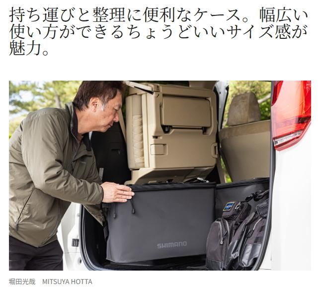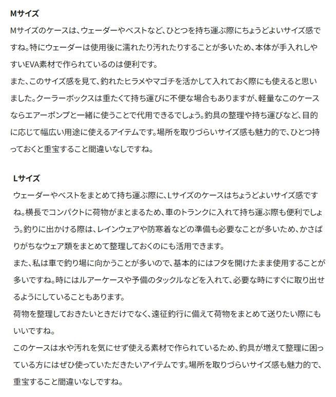 フィールドで汚れがちなベストやウェーダーなどのフィッシングギアを、そのまま車に入れると車内を汚してしまったり、ニオイが残ってしまうこともあります。このEVA溶着仕様のケースは防水性に優れ、汚れにくいため、これらのアイテムを収納するのに適しています。