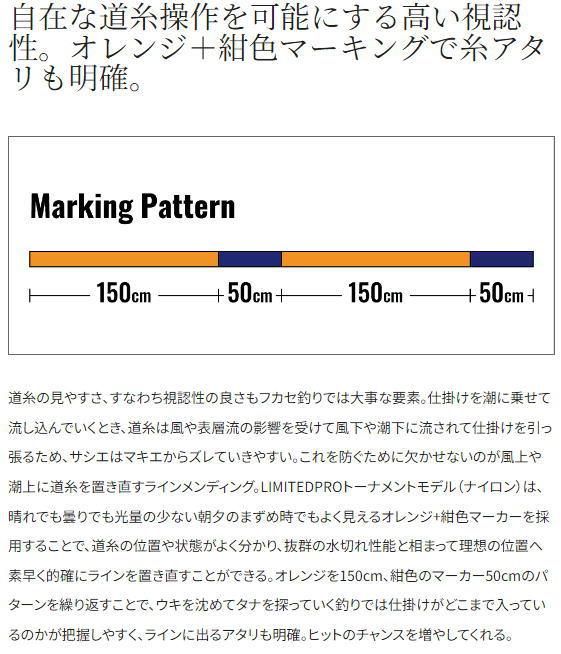 LIMITEDPROトーナメントモデル(ナイロン)は、釣り糸表面を大気圧プラズマ処理することで、さばきやすさに直結する撥水性などフカセ釣りに適した特性に表面を改質。従来のコーティングに比べて初期性能を長く維持し、ストレスのない釣りを実現する。また、刻一刻と変わる天候や光量でも高い視認性を誇るオレンジ+紺色マーカー、並行巻き、絶妙な張りとしなやかさを兼ね備え細号数から太号数まで同等の使用感を実現するなど、ポテンシャルと使いやすさにこだわり抜いた仕上がりになっている。