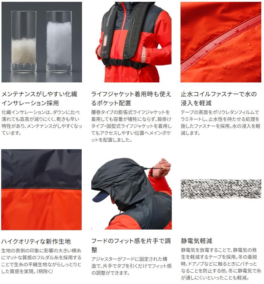 シマノの防水透湿基準「ドライシールド」をクリアした、メンテナンスしやすい化繊インサレーションレインスーツ。ライフジャケットを着用した際のポケットの位置や釣りの動きにあわせた中綿の配置など、釣り場で考えぬいて形にしたコストパフォーマンスに優れるレインスーツです。
